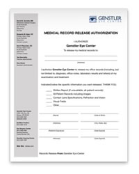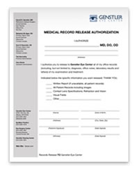 To have your records from another medical practice sent to Genstler Eye Center, please fill out our Authorization for Release of Medical Records Form and mail or return it to Genstler Eye Center.